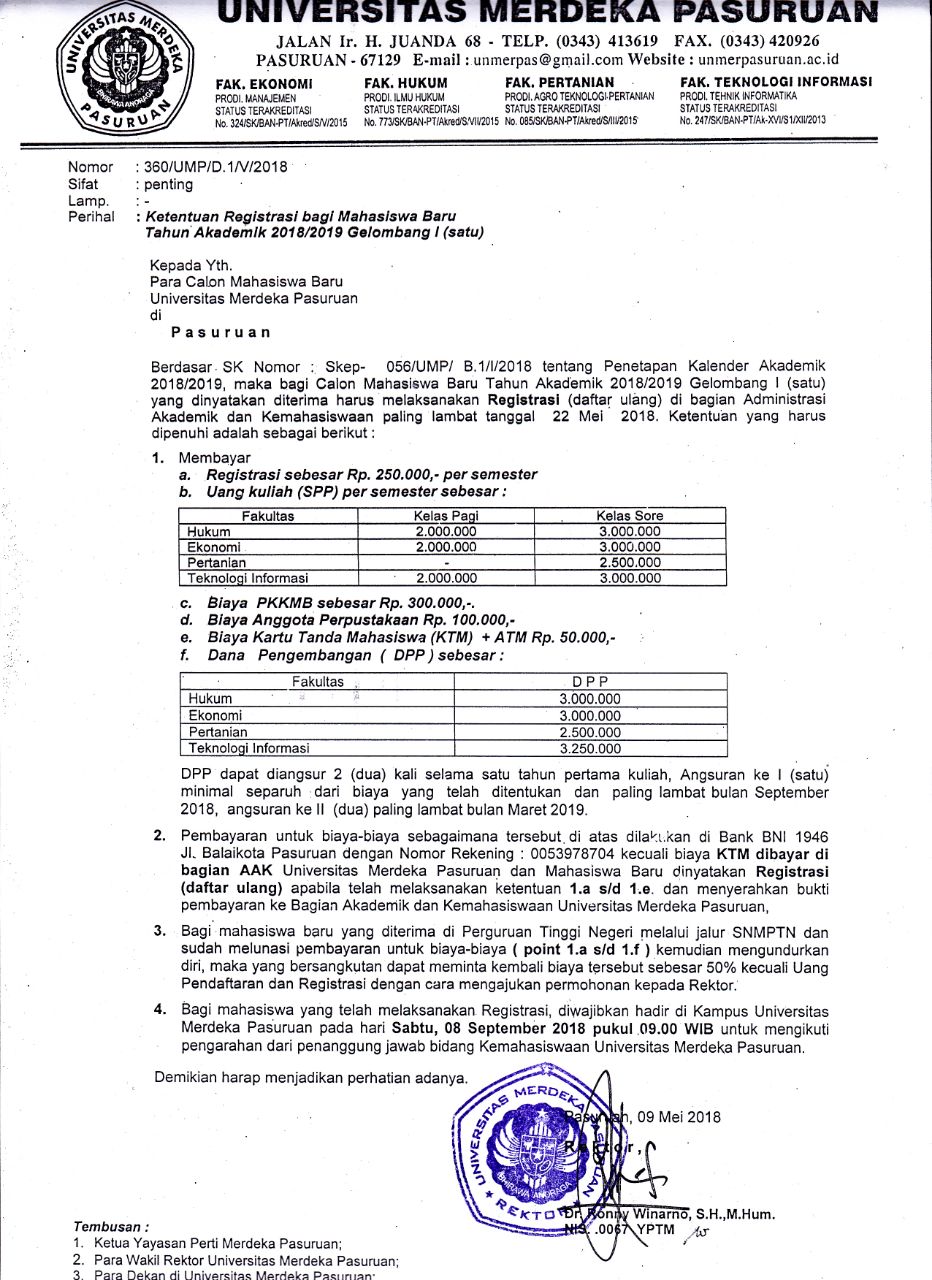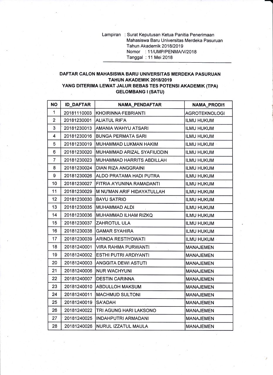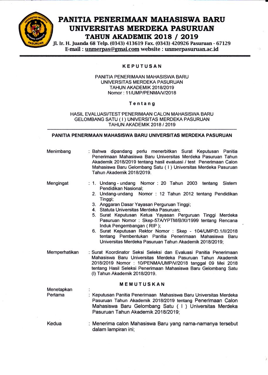 Sehubungan dengan berakhirnya penerimaan calon mahasiswa baru gelombang I tahun 2018/2019 Universitas Merdeka Pasuruan berikut adalah surat keputusan panitia penerimaan mahasiswa baru Universitas Merdeka Pasuruan tahun akademik 2018/2019 tentang hasil evaluasi / test penerimaan calon mahasiswa baru baik melalui jalur TPA (Tes Potensi Akademik) atau Jalur Bebas Tes.