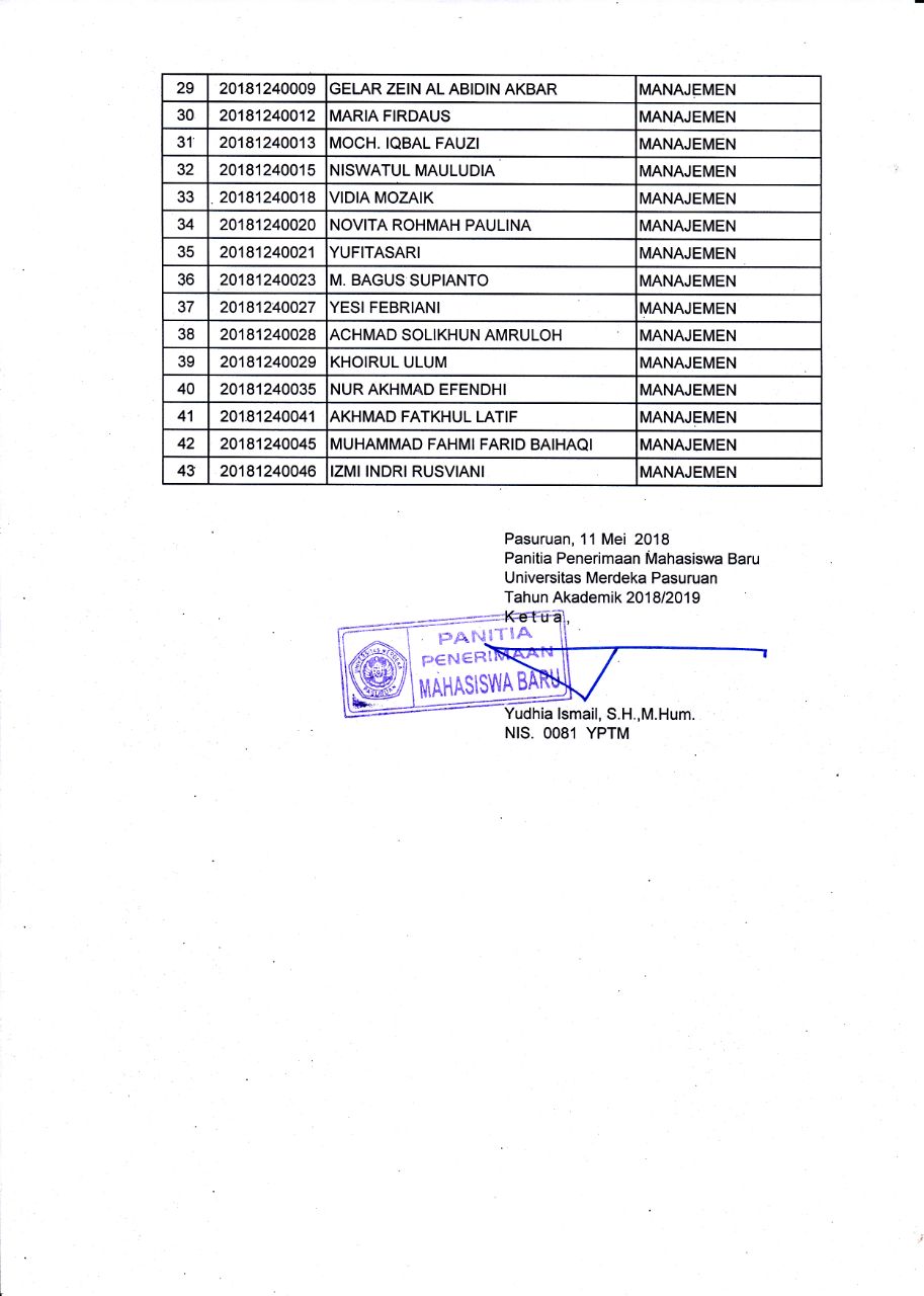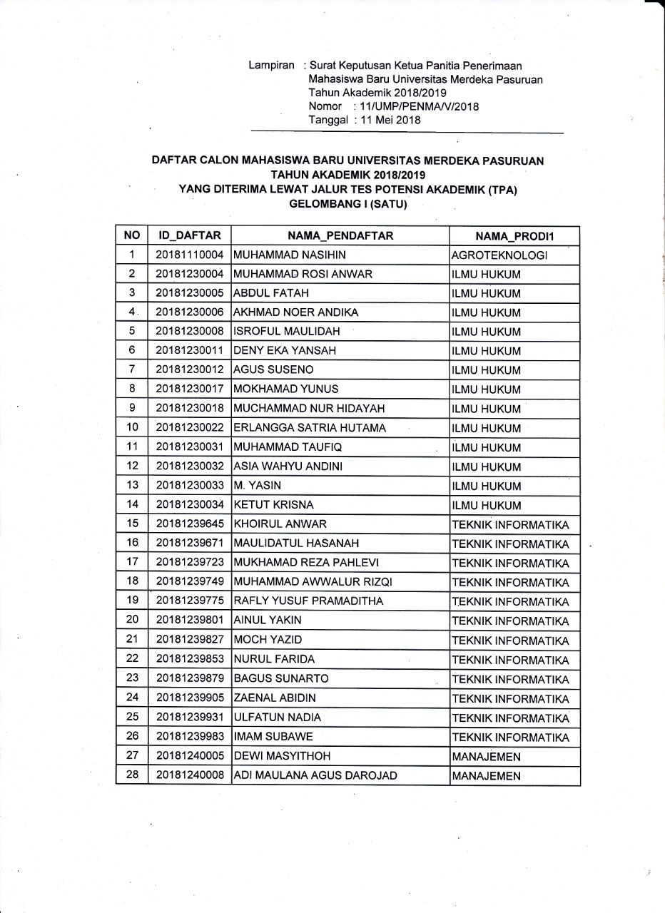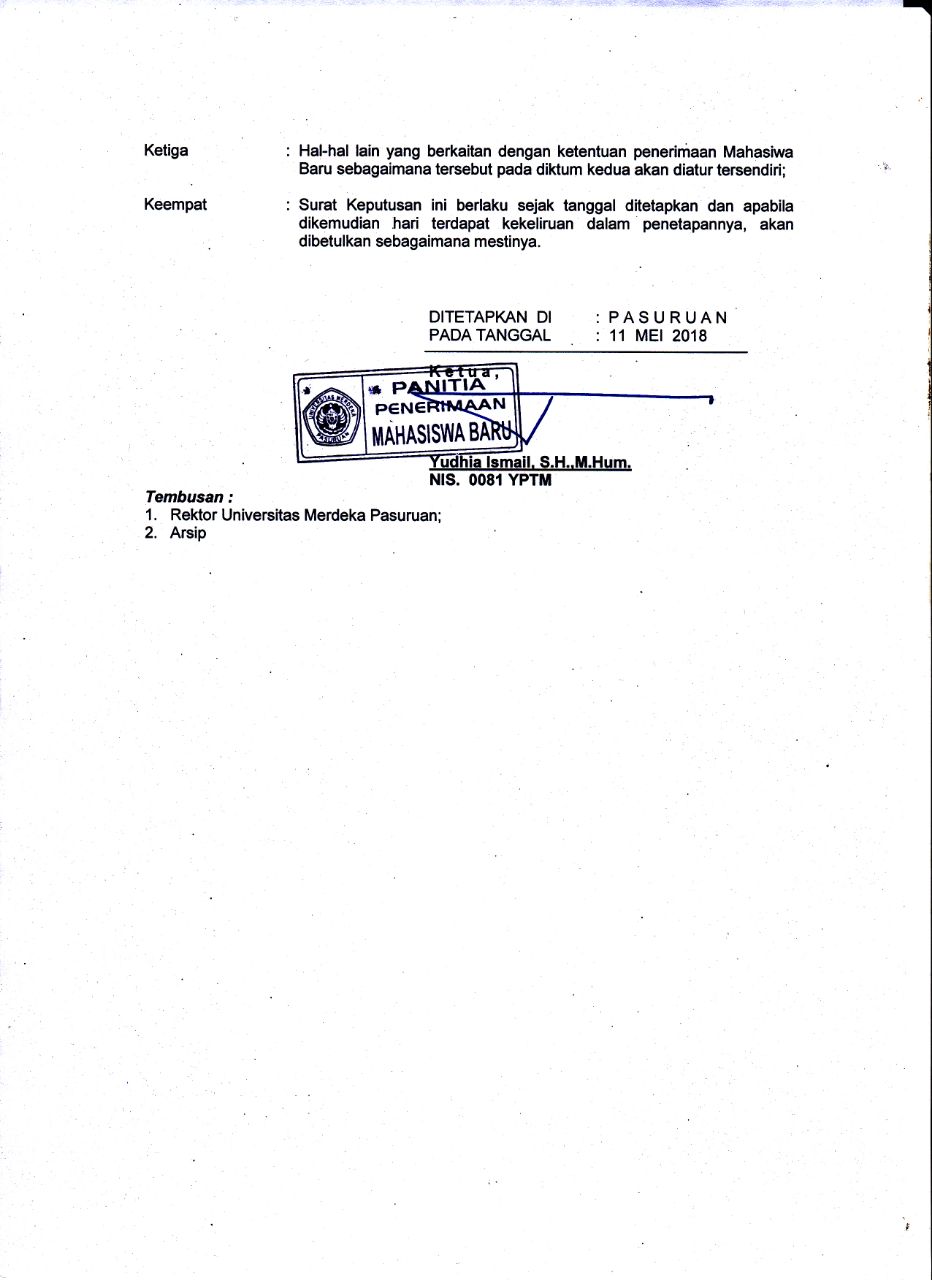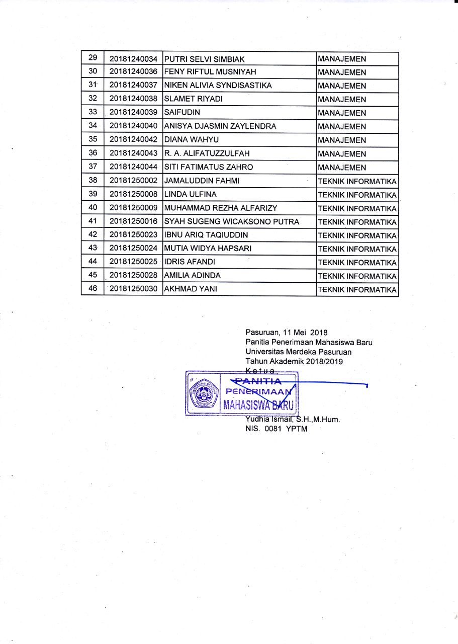 Sehubungan dengan berakhirnya penerimaan calon mahasiswa baru gelombang I tahun 2018/2019 Universitas Merdeka Pasuruan berikut adalah surat keputusan panitia penerimaan mahasiswa baru Universitas Merdeka Pasuruan tahun akademik 2018/2019 tentang hasil evaluasi / test penerimaan calon mahasiswa baru baik melalui jalur TPA (Tes Potensi Akademik) atau Jalur Bebas Tes.